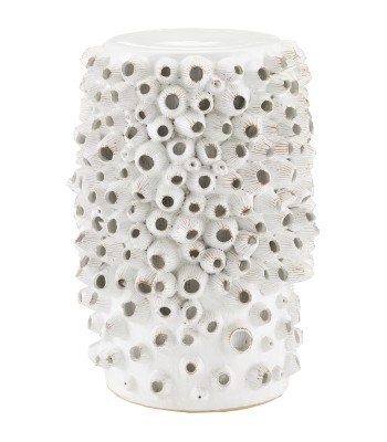 The Barnacle White Side Table is made by a group of women who live at the border of Burma and Thailand. Made from ceramic, this incredible hand-thrown table is completely covered in handmade ornamentations that look like small barnacles. Once the decorative elements are in place, the vase is glazed with an antique white that provides the table with its depth and personality.