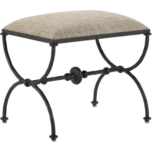 The curvaceous sides and the ornamented stretcher of the Agora Peppercorn Ottoman are made of iron that has been treated to a rustic bronze finish. The upholstered top, covered in a Calcutta Peppercorn fabric, is a padded contrast to the strong stance of the metal onto which it is fitted. The fabric is made of 100-percent polyester. We also offer the Agora Peppercorn as a bench. Cleaning code: S. Also available in muslin.