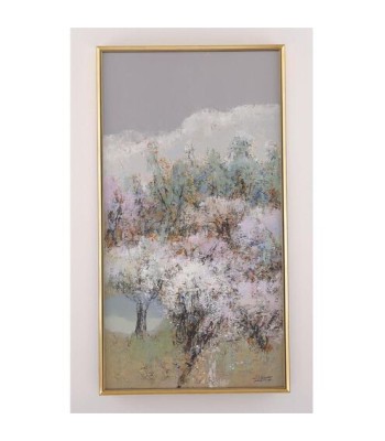 Sylvan Stroll by artist LM Zhou is a serene oil painting on canvas that depicts gorgeous trees in pastel tones below a gray sky. This soothing natural motif is displayed within a gold gallery frame.