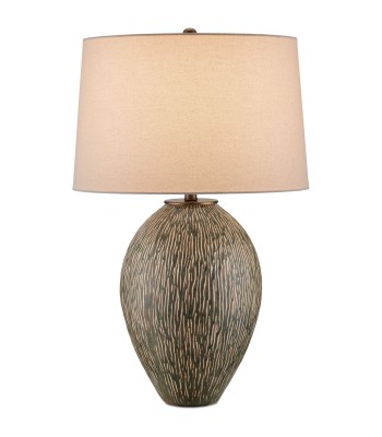 The Hildreth Table Lamp is awash in a textural pattern in an olive green and beige color combination. Made of porcelain, the dark green lamp gains a sense of movement from the flowing lines that ornament its surface. The fact it culminates without a base, and has an antique brass finish on the hardware and finial brings this composition great warmth.